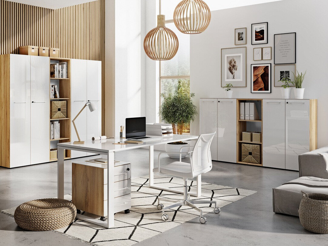 Darbo baldų kolekcija įkūnija modernų interjero stilių. Balta spalva šiai kolekcijai suteikia elegancijos, o „Navarra“ ąžuolo spalva - natūralumo. Šioje kolekcijoje vyrauja grūdinto stiklo paviršiai, kuriuos papildo chromuotos rankenėlės. Šios kolekcijos baldų korpusai padengti bespalve medžiaga, kuri apsaugo juos nuo smulkių įbrėžimų. Šios medžiagos pagalba baldas tampa atsparus ne tik įbrėžimams, bet ir geriau apsaugotas nuo drėgmės ar dėmių. Funkcionalumas ir patogumas yra neatsiejamas šios, Vokietijoje pagamintos kolekcijos bruožas. Spintelės su tylaus uždarymo mechanizmu, apsaugo dureles ir stalčius nuo greito užsidarymo, o užrakinamas stalčius bei durelės suteikia privatumo. Susikurkite modernią darbo aplinką su šia kolekcija.