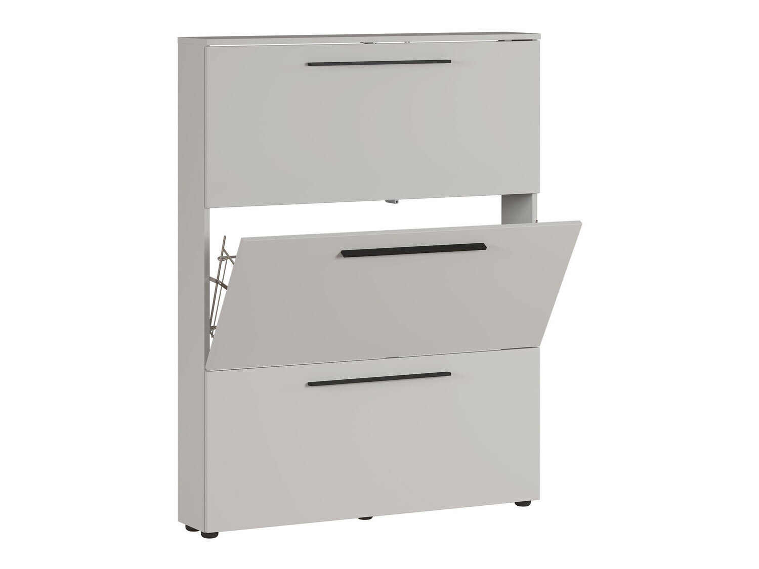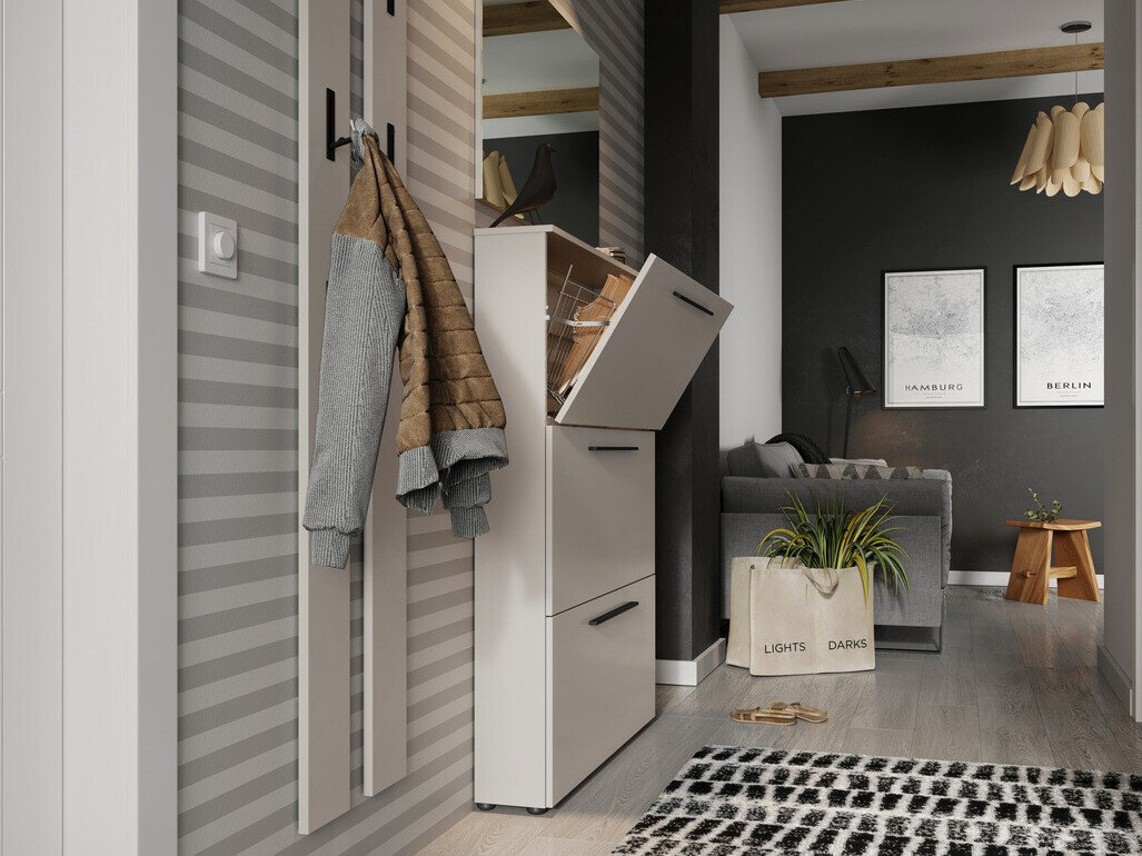 Šiuolaikiško dizaino prieškambario baldų kolekcija pradžiugins kiekvieną modernumo mėgėją. Šią kolekcija papildo ilgos juodo metalo rankenėlės, kurios puikiai įsilieja į baldų dizainą. Baldus nesunku prižiūrėti, nes jie yra padengti bespalve medžiaga, kuri apsaugo juos nuo smulkių įbrėžimų, bei leidžia nesunkiai nuvalyti susikaupusius nešvarumus. Kolekcijos baldų briaunos padengtos apdailos juosta, kuri pagaminta iš tvirto plastiko ir apsaugo baldus nuo smulkių pažeidimų. Stalčiai bei durelės turi tylaus uždarymo mechanizmą, kuris yra ypatingas tuo, kad apsaugo juos nuo greito užsidarymo. Siauros spintelės puikiai prisitaikys prie jūsų namų dizaino, o juose esantys metaliniai batų laikikliai užtikrins patogų batų laikymą. Funkcionalumas ir patogumas yra neatsiejamas šios, Vokietijoje pagamintos kolekcijos bruožas. Susikurkite modernią aplinką su šia baldų kolekcija.