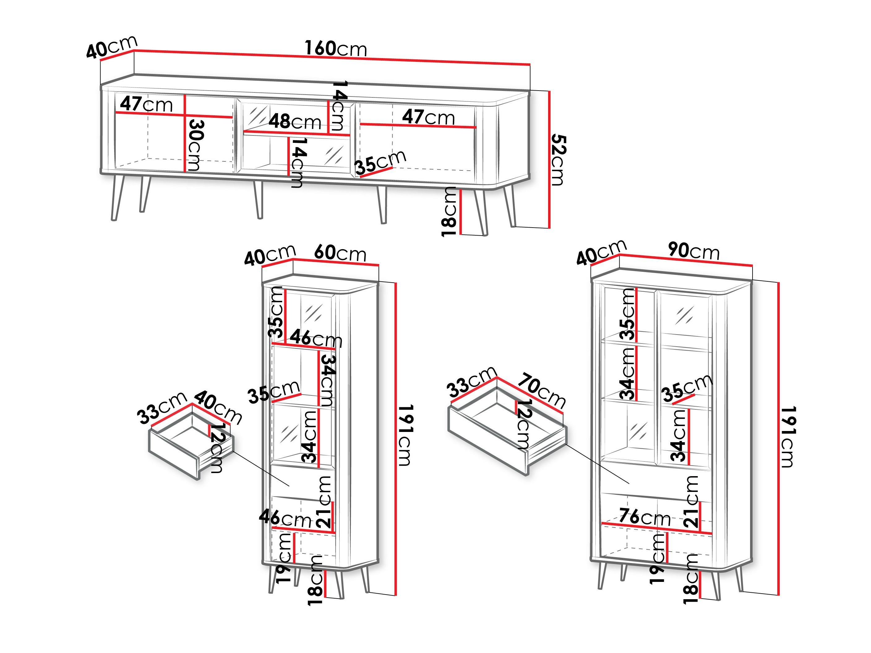 191 x 90 x 40; 191 x 60 x 40 cm