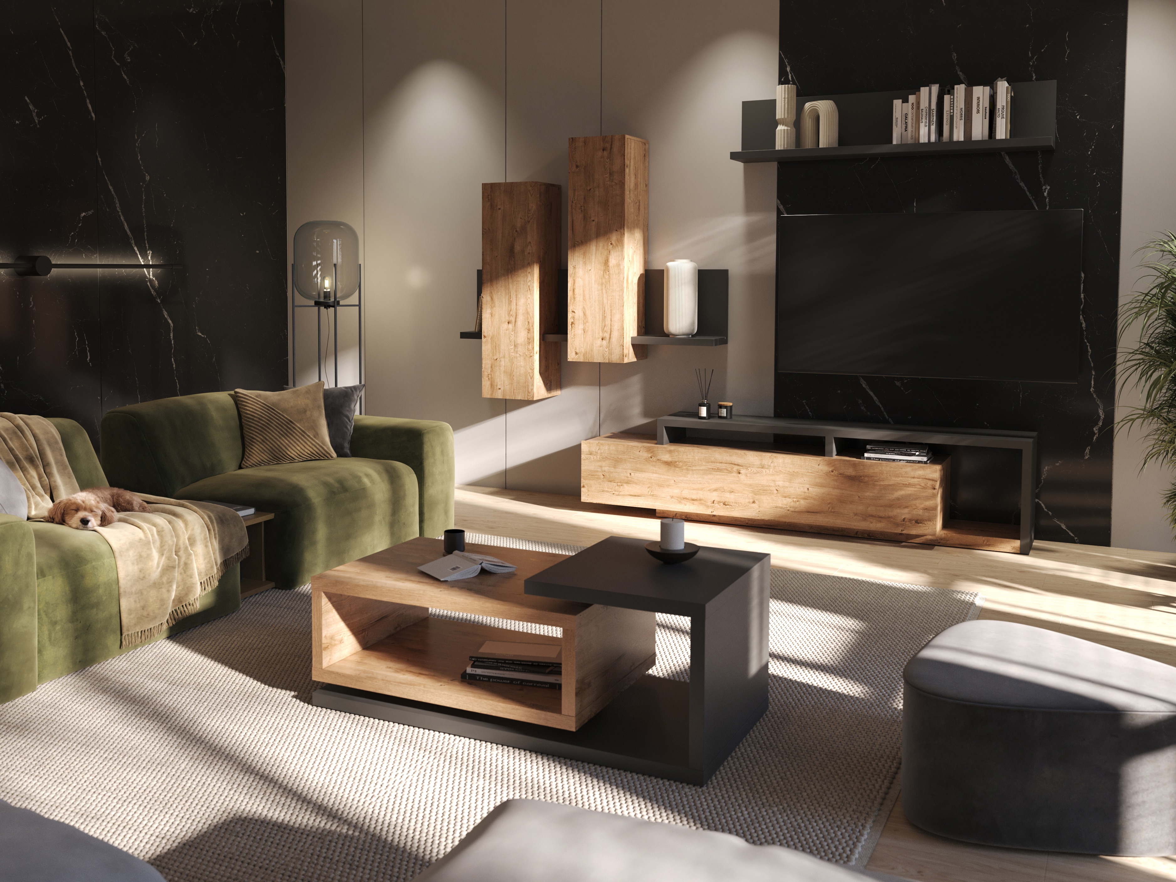Kolekcija yra puikus pasirinkimas svetainei, kurioje visada yra laukiami svečiai. Keli spalvų variantai leidžia sukurti skirtingas kompozicijas. Balti ir pilki baldų atspalviai puikiai tiks industriniam stiliui. Pilki paviršiai, imituojantys akmens struktūrą, derinami su matine balta spalva atrodo itin elegantiškai. Baldai su natūraliu medžio raštu ir grafito spalvos elementais pabrėš interjero unikalumą. Baltos ir medžio spalvų derinys puikiai derės prie skandinaviško stiliaus interjero.