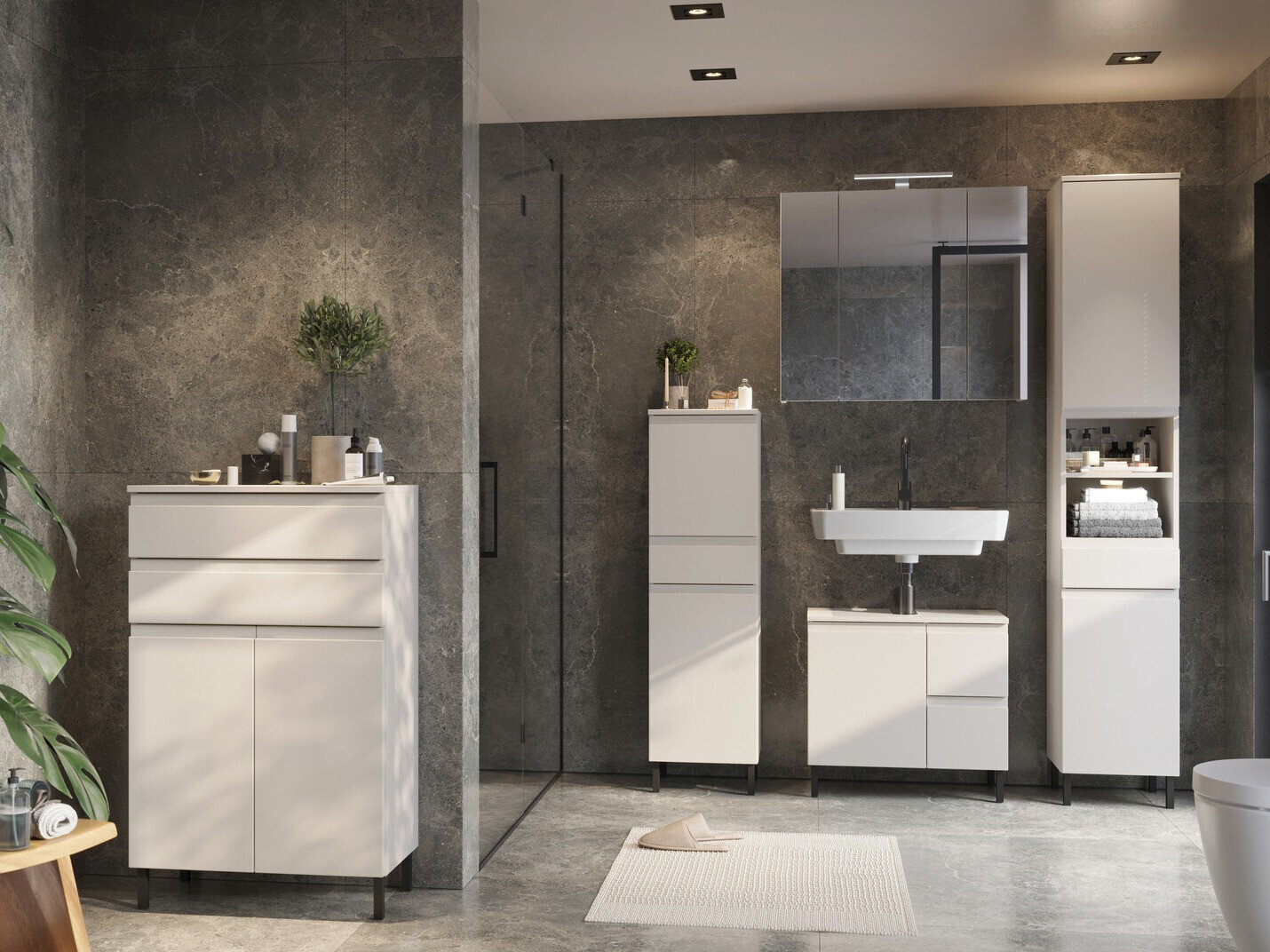 Vonios kambario baldų kolekcija padės susikurti modernų interjerą vonioje. Šioje baldų kolekcijoje galite rinktis iš kelių spalvų variantų. Kolekcijos baldai gali būti tamsesnės ir šviesesnės spalvos. Kolekciją papildo metalinės kojelės, kurios suteikia interjerui lengvumo. Visi kolekcijos baldai padengti bespalve medžiaga, kuri apsaugo baldus nuo smulkių įbrėžimų. Plastiku padengtos baldų briaunos yra atsparios mechaniniams pažeidimams, atsirandantiems dėl kasdienio naudojimo. Stalčiai bei durelės turi tylaus uždarymo mechanizmą, kuris yra ypatingas tuo, kad apsaugo nuo greito užsidarymo. Funkcionalumas ir patogumas yra neatsiejamas šios, Vokietijoje pagamintos kolekcijos bruožas. Kolekcijos baldai turi reguliuojamų lentynų funkciją, kuri leidžia susikurti patogiausią daiktų laikymo būdą. Susikurkite šiuolaikiška vonios kambarį su šia baldų kolekcija.