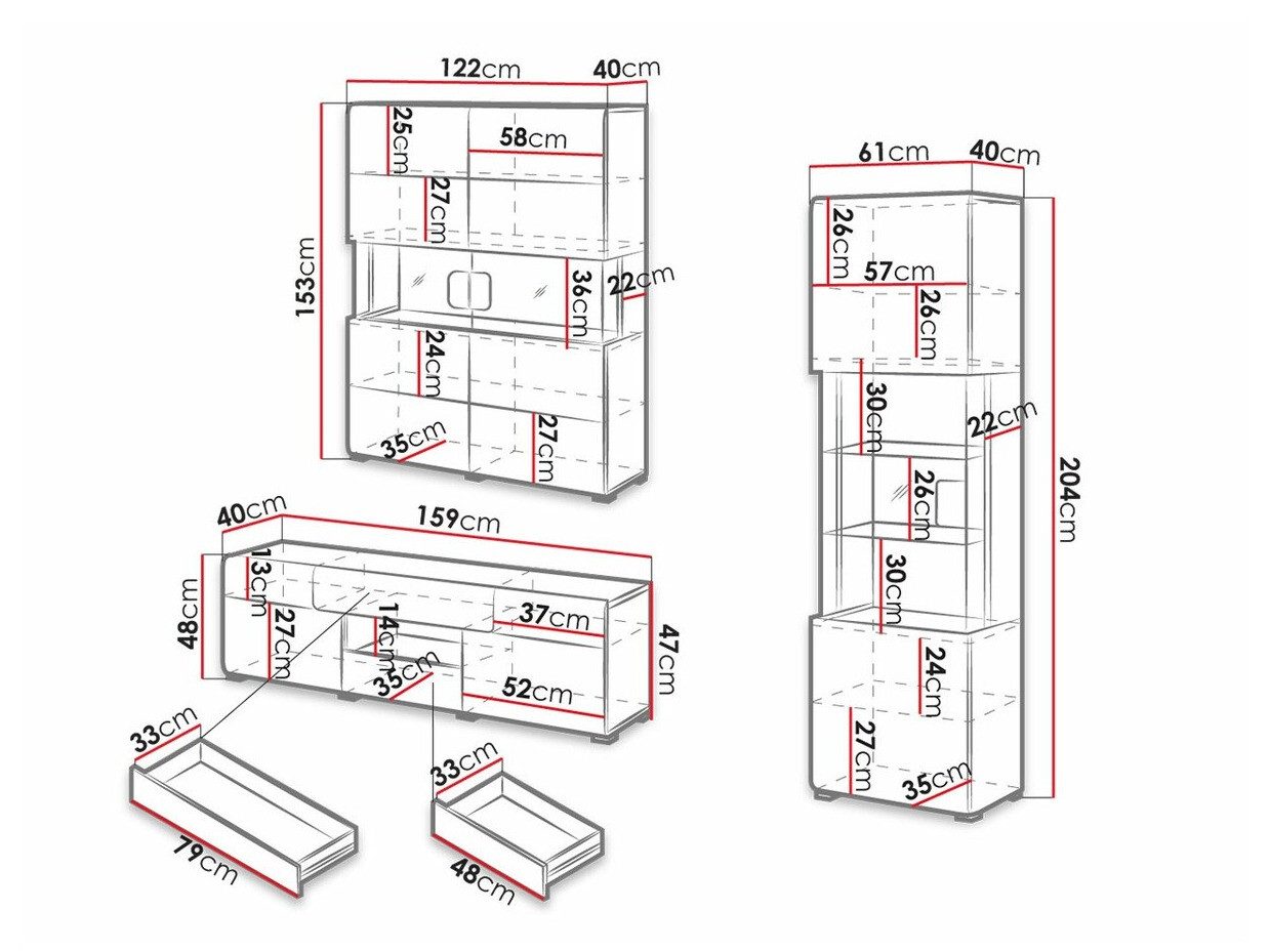 Baldų kolekcijoje rasite įvairių dydžių spintelės, erdvias komodas, lentyną bei žurnalinį staliuką. Blizgi baldų apdaila optiškai padidins interjerą. Komodų dureles ir stalčius galėsite atidaryti vos vienu paspaudimu, nes jose įmontuotas „Push to open“ mechanizmas garantuoja patogumą.