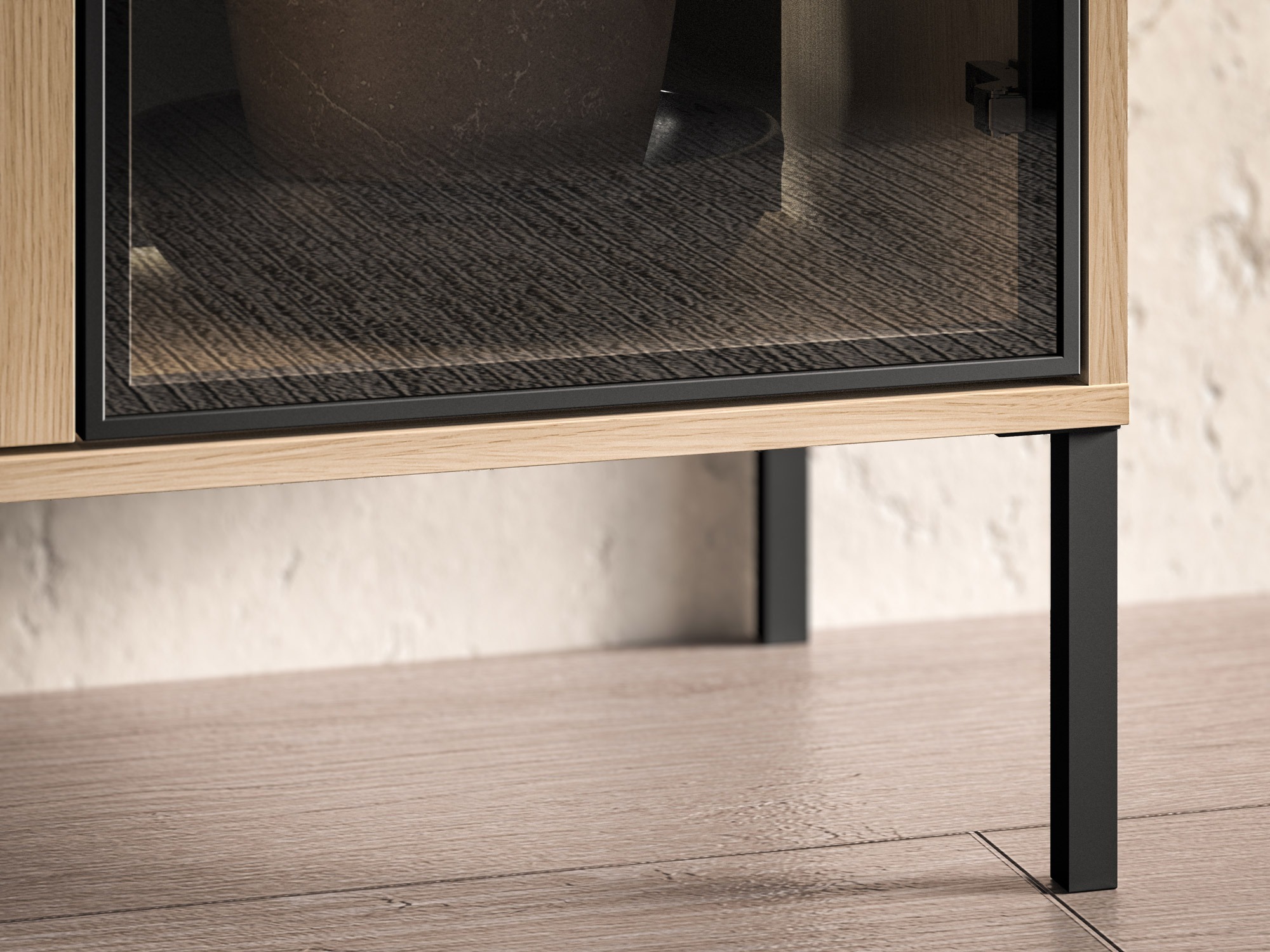 Šie modernaus stiliaus baldai išsiskiria švariomis linijomis ir subtilia estetika, leidžiančia lengvai priderinti juos įvairaus stiliaus interjeruose. Minimalistinės rankenėlės čia derinamos su patogiu paspaudimo mechanizmu, todėl baldų fasadai išlieka vizualiai vientisi ir neperkrauti. Integruotas tylaus uždarymo mechanizmas užtikrina lėtą ir sklandų durelių bei stalčių užsidarymą. Papildomą jaukumo ir modernumo pojūtį kuria lentynose įmontuotas LED apšvietimas, kuris subtiliai apšviečia erdvę ir išryškina baldų dizaino detales. Tai puikus sprendimas ieškantiems funkcionalių ir estetiškų baldų.