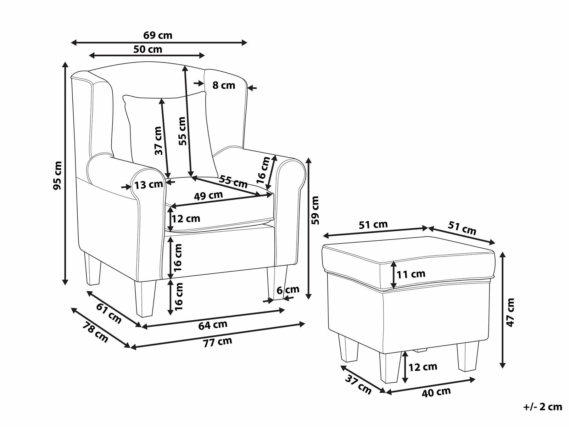 Pufo matmenys: