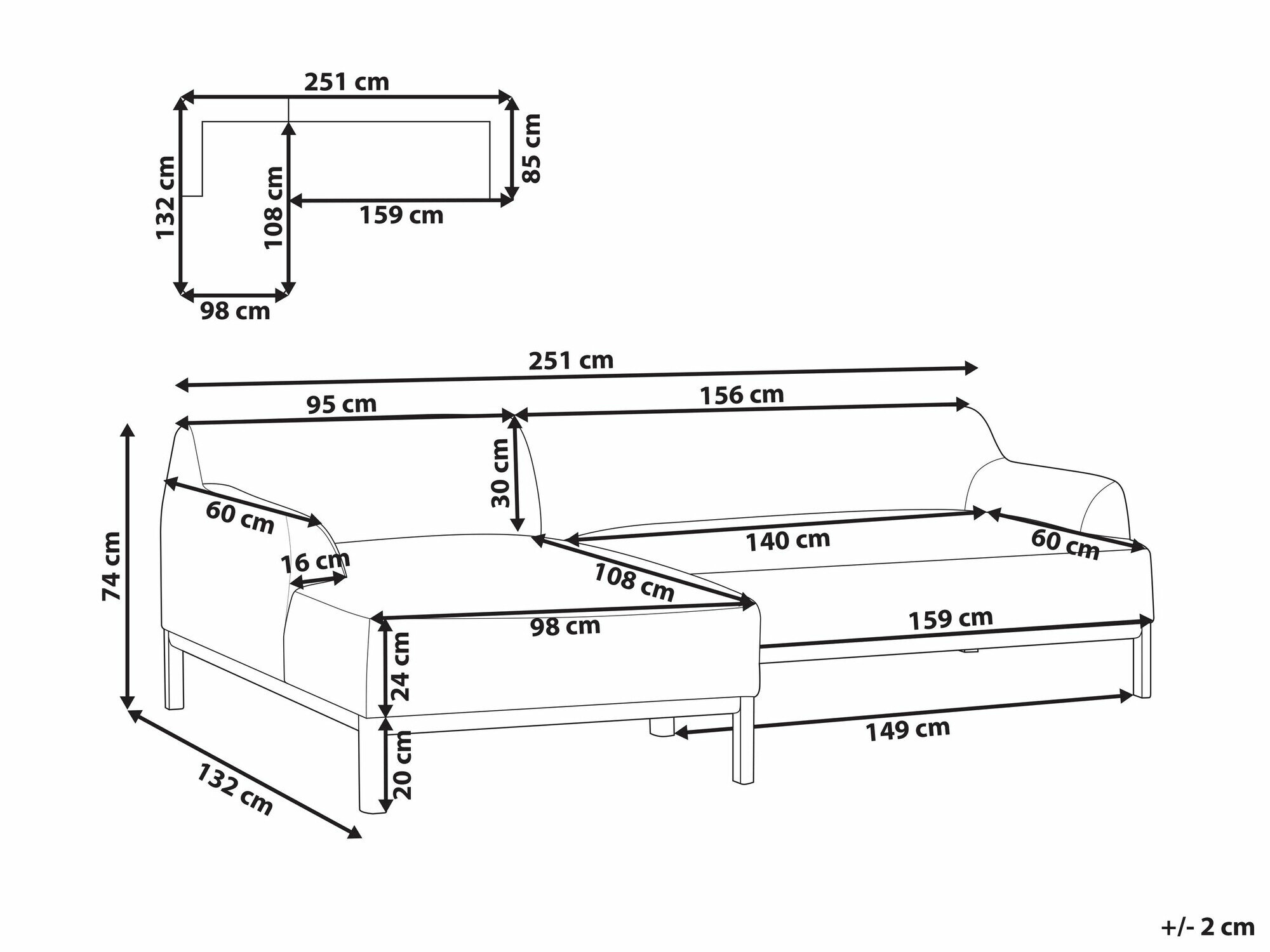 74 cm  251 cm  132 cm