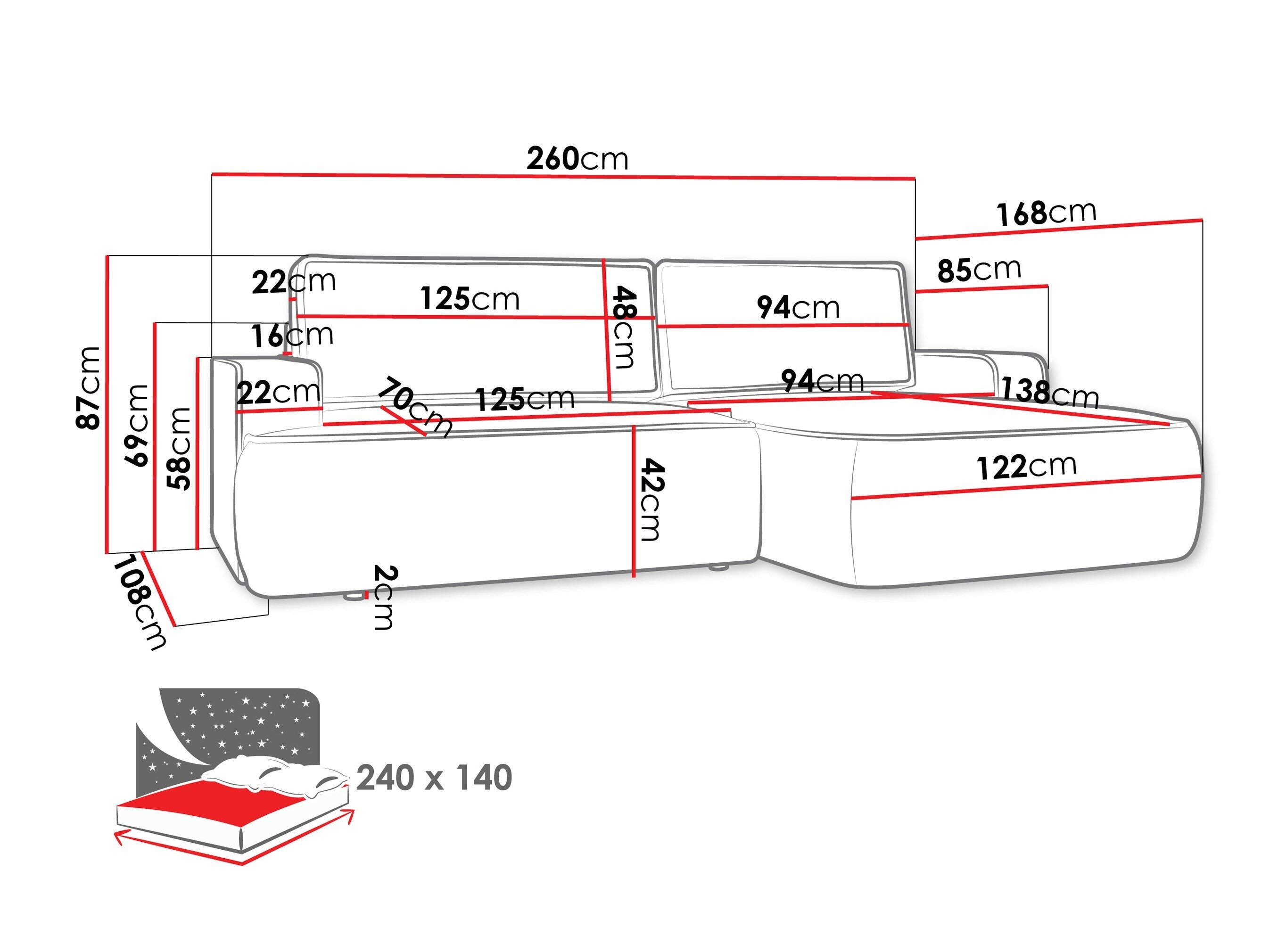 87 cm  260 cm  168 cm