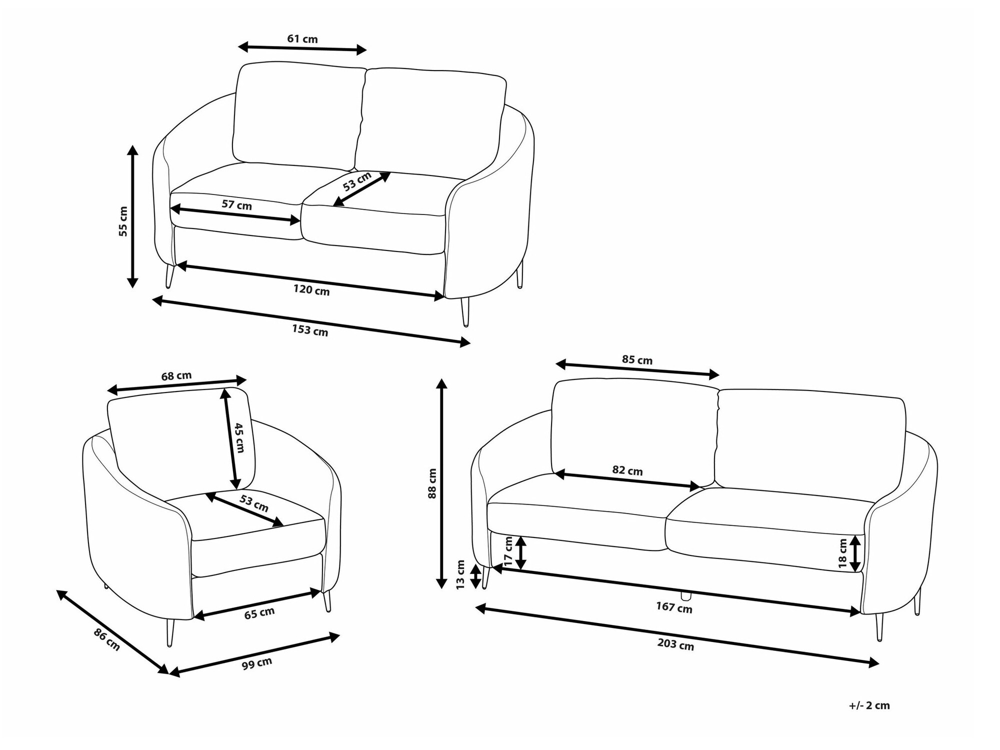Trivietės sofos matmenys: