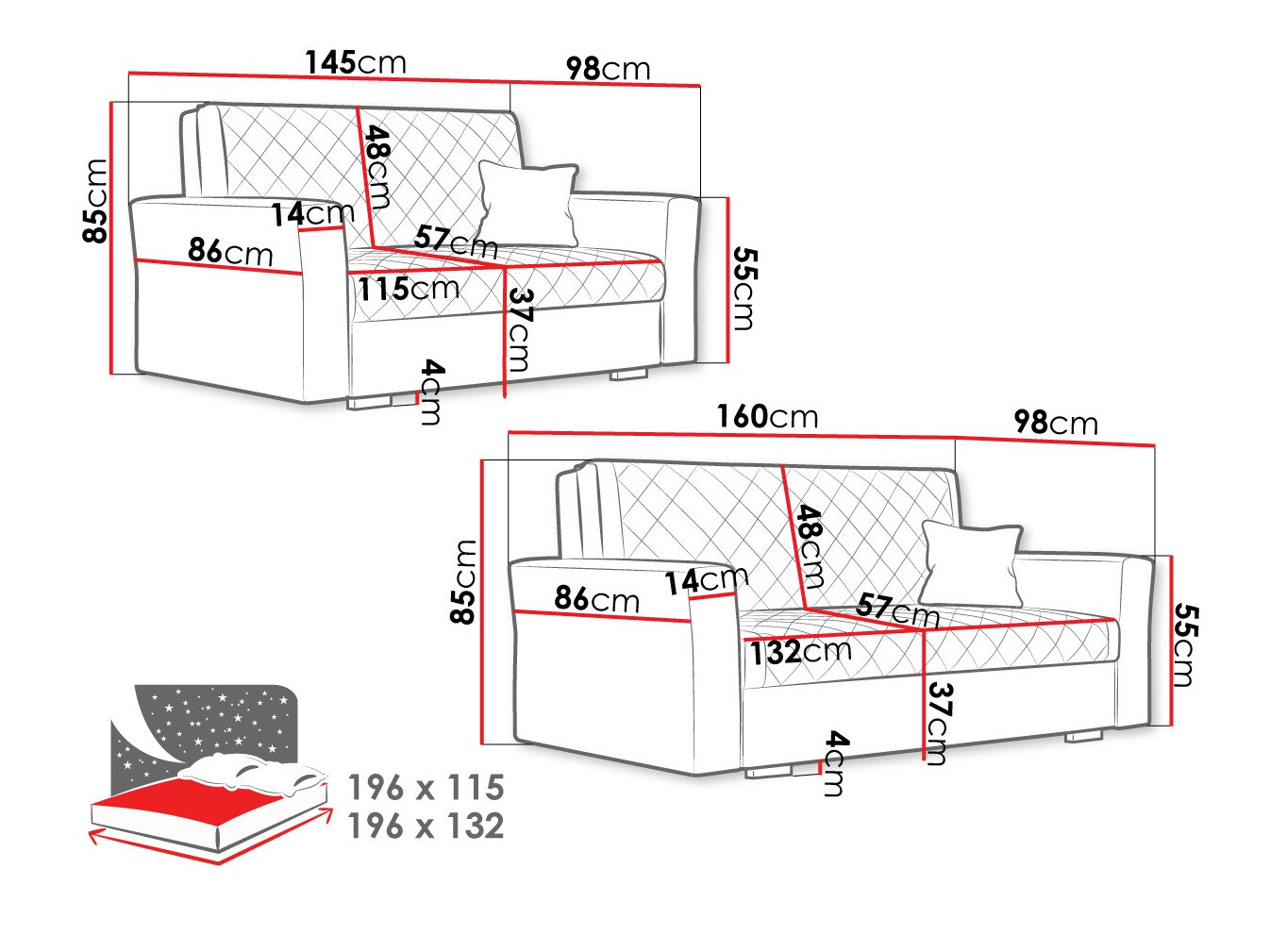 Dvivietės sofos matmenys: