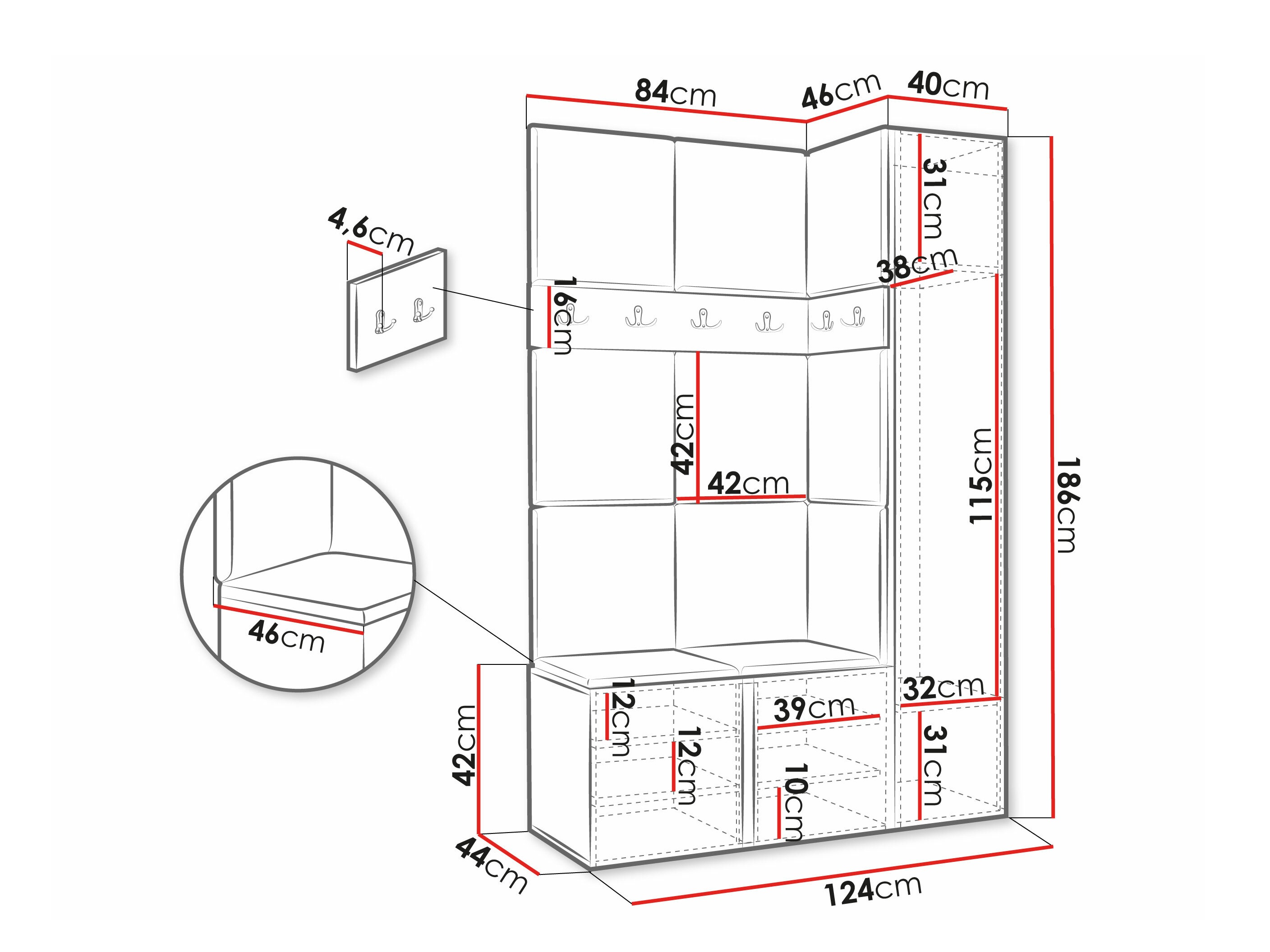 Prieškambario baldai atrodo gerai ir atrodo kokybiški. Nedidelį pakeitimą padarėme, pakabą dėjome plokščių viršuje, o ne tarp jų, kad būtų daugiau vietos švarkams ir paltams. Vienintelis minusas būtų per didelė kaina, turint omenyje, kad už apmuštų plokščių nėra faneros, jos klijuojamos tiesiai prie sienos ir jokie klijai nepateikiami, reikia pirkti atskirai