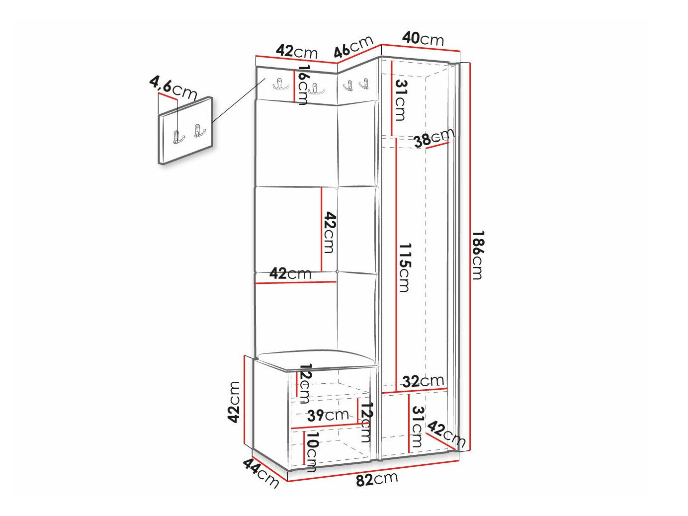 186 cm  42 cm  46 cm